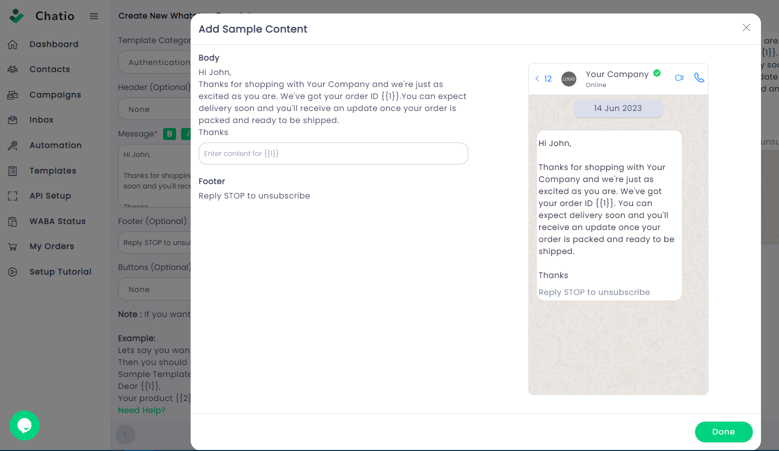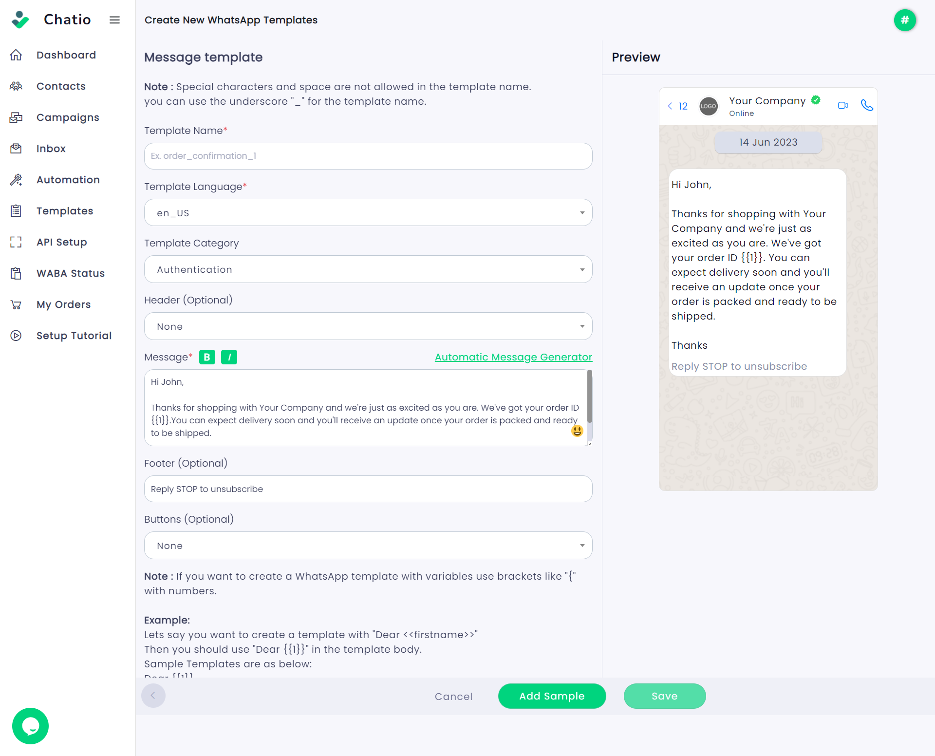 **Step 3**: If you wish to include any media files, you can click on the "Add Sample" button and upload your media files. Please note that the size of the media files should be less than 5MB.