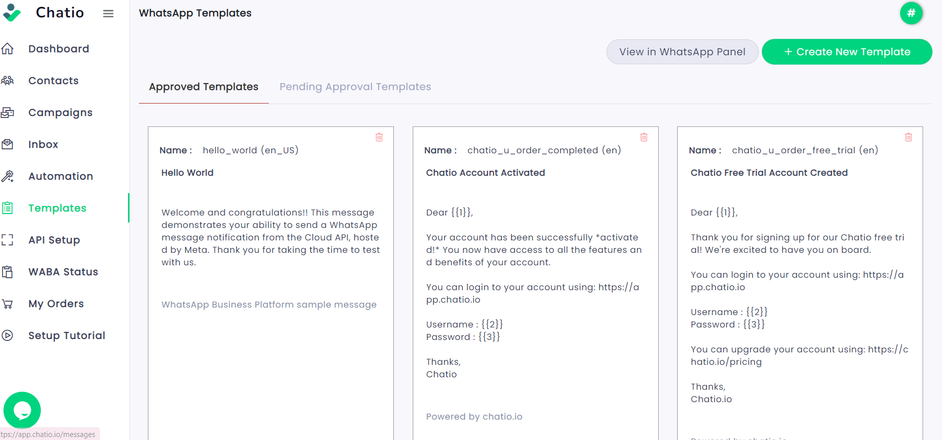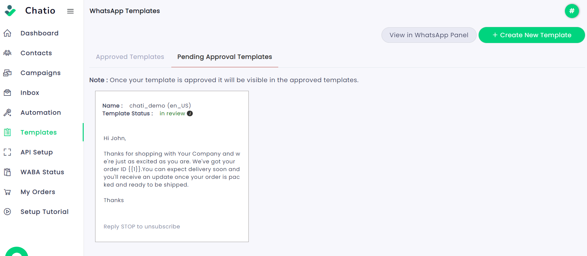**Step 4**: After clicking on the "Save" button, you will be directed to a screen where you can view the template you have created. In the "Pending Approval Templates" panel, you will be able to see the status of your template, whether it is marked as "failed" or "in review".